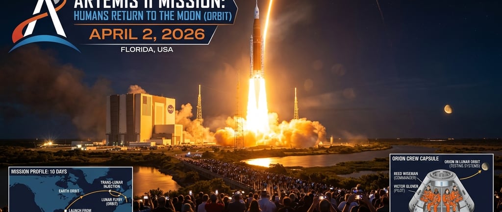 NASA's Artemis mission 2... Rocket launches to take humans to the moon after 54 years, takes off from Florida. A golden chapter has been written in the field of space science today, on 2 April 2026. NASA has successfully launched the 'Artemis 2' mission from the Kennedy Space Center in Florida at 3:54 am Indian time by means of a giant SLS rocket.